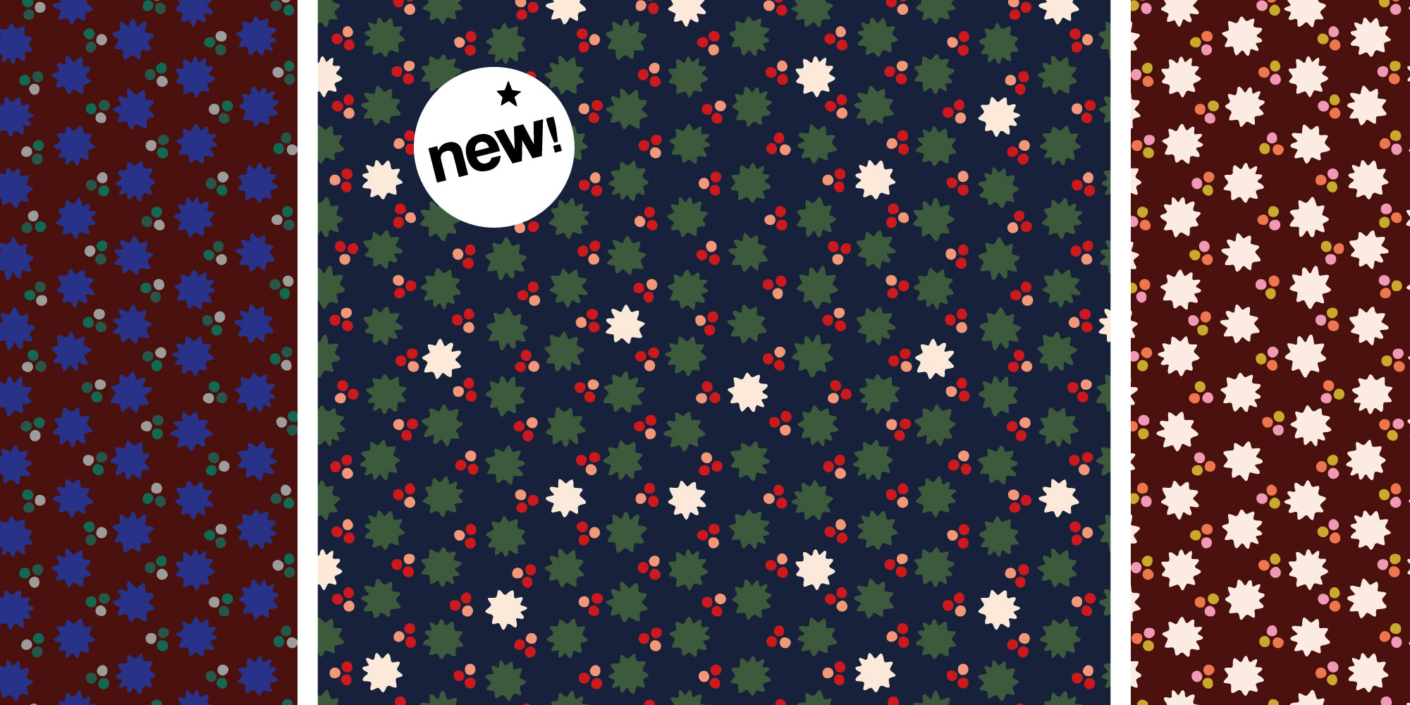 motif-pattern de formes étoilées alignées et ponctuées de trios de pois comme des baies de houx. Version pour les fêtes disponibles! by Oyeah Studio-Marion Rousseau